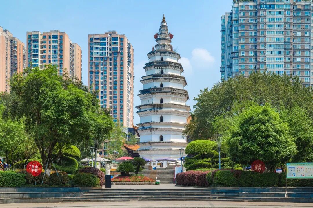 报恩塔矗立在游人如织的繁华闹市,朝阳洒在洁白塔身。