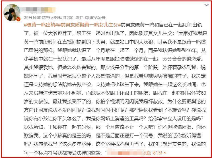 如今,这位前男友不忍了,他曝出了他和黄一鸣的真实情况,并大爆黄一鸣猛料,质疑闪闪生父的身份。