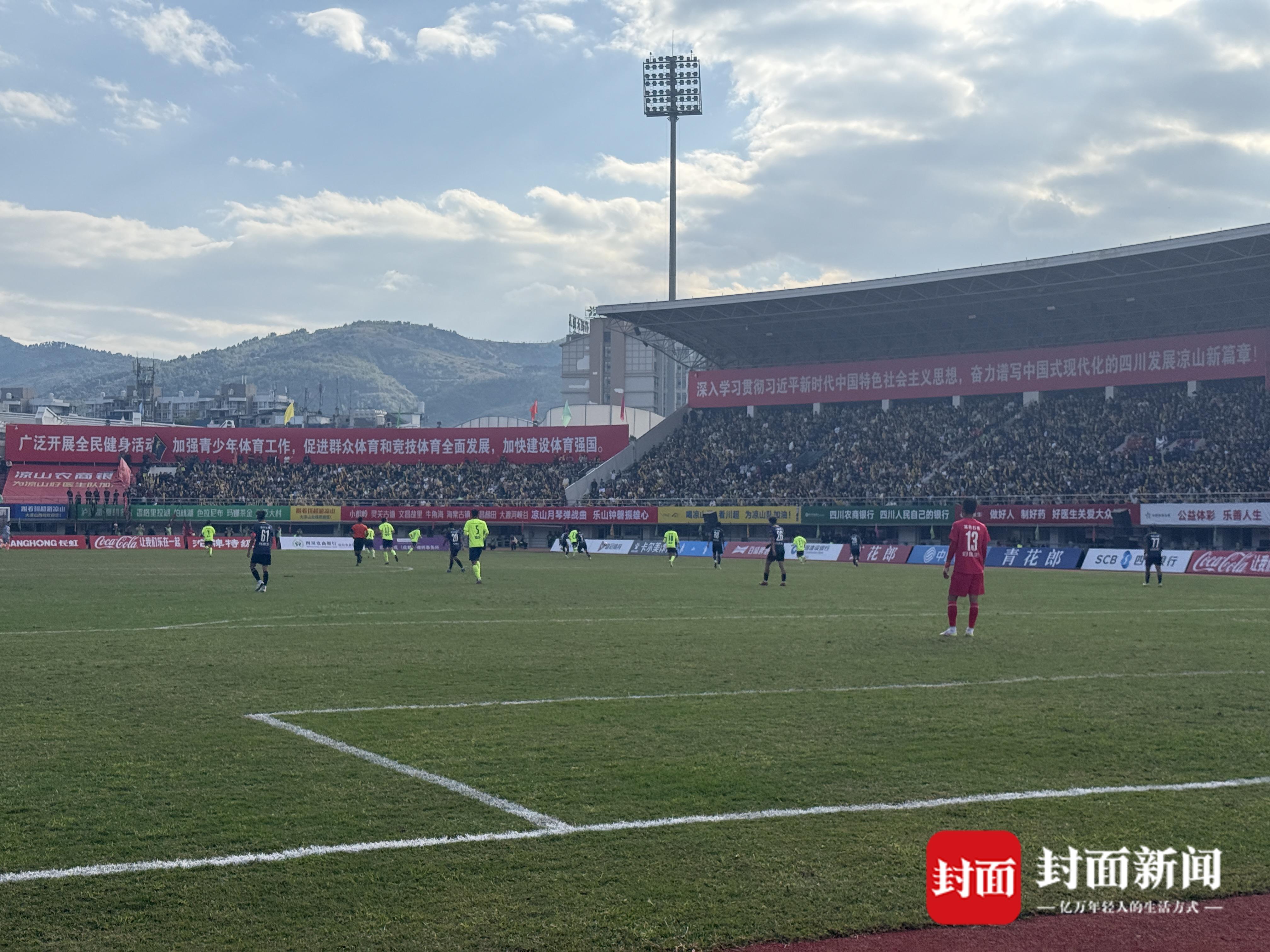 “凉山得啦、乐山雄起”声音此起彼伏,排山倒海,响彻整个赛场,人浪一阵接着一阵,双方球迷融入比赛,成为自己主队里最忠实、最卖力的第12位球员。