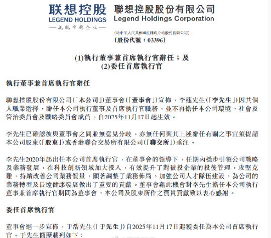 同时,董事会进一步宣布,联想控股委任于浩为新CEO,自2025年11月17日起接任。